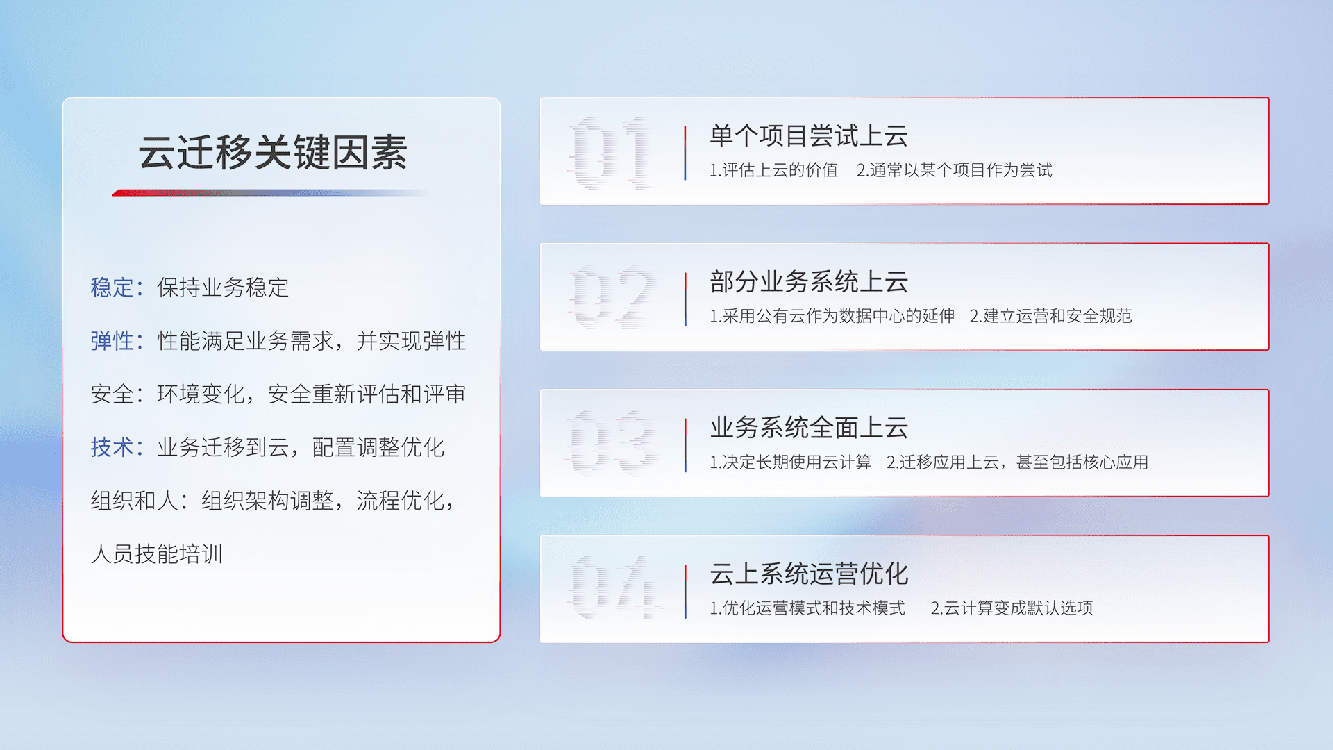 结合实际业务,,,,从规划设计、、、、云平台选型、、、、云原生改造、、、数据迁移、、集成交付,,,迁移全过程为客户识别最佳上云路径,,,,做好风险识别管理,,设计网络架构、、、、身份权限、、、安全审计合规、、、操作审计、、、日志审计、、、监控告警策略、、、多站点容灾设计等,,对云上基础设施进行整体规划,,,提升IT治理水平,,,,以满足弹性、、高可用、、、高性能的需求。。。。