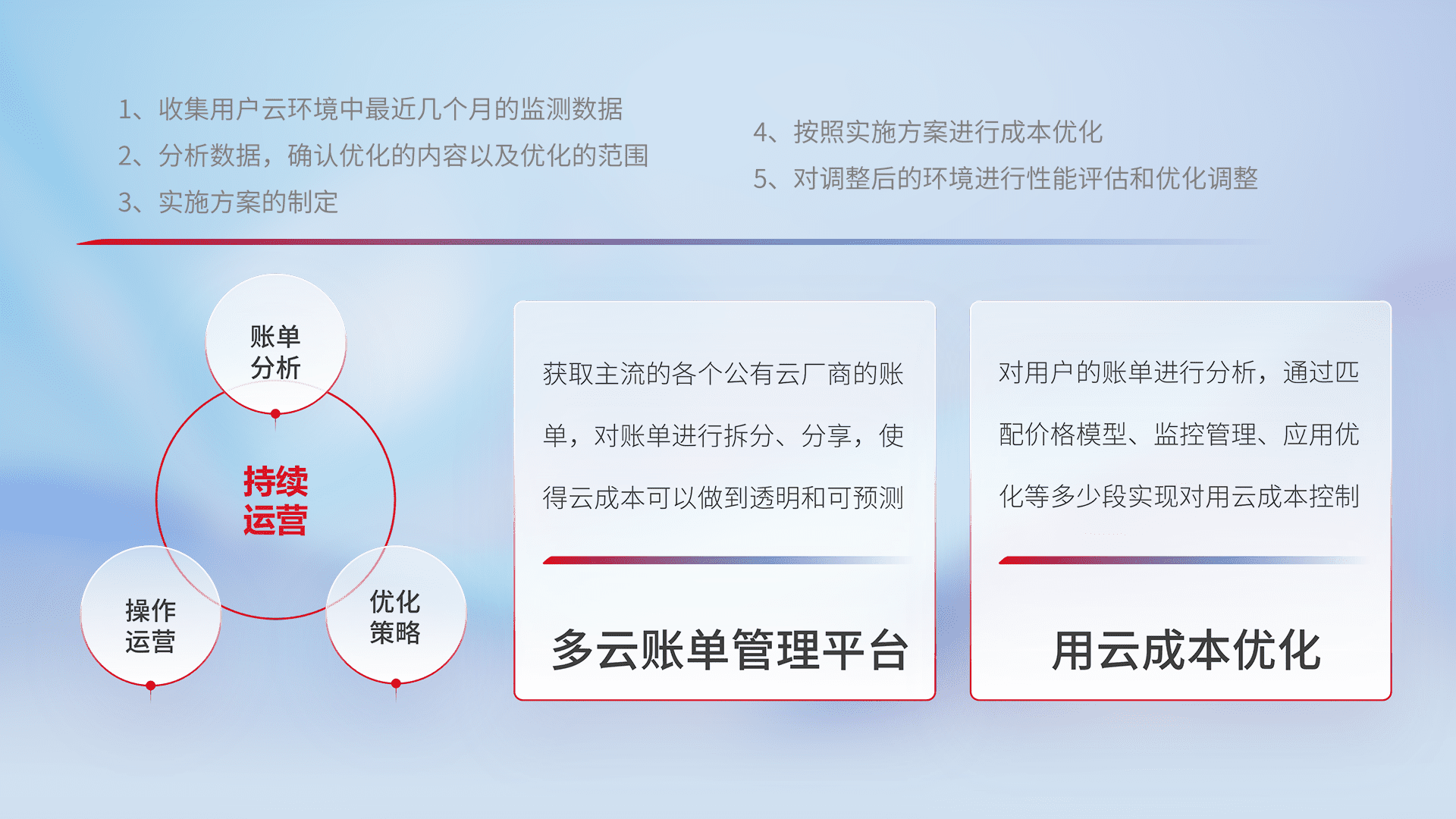 通过多云纳管,,,,以统一的资源数据模型把客户的云资源进行抽象和封装,,,,进而实现对多云资源的统一操作,,保障云资源管理的可靠性、、稳定性与可用性。。。。量身定制化运维内容,,,,配置、、开发运维、、、、补丁管理、、、备份、、、监控、、认证和访问管理、、、审计和日常巡检等,,保障在用云过程中的可靠度,,稳定度以及高可用率。。。